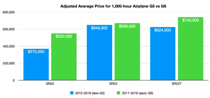 For starters, we’ve used AeristaMetrics to compare the average selling prices of late G5s (2015-16) vs early G6s (2017-18) to understand if the purchase price gap justifies spending $30k-$50k on a Perspective+ upgrade, versus buying a newer airplane with Perspective+ as original equipment. The results are mixed: our last six months of transaction data suggest that buying and upgrading an SR20 or SR22T could be a good move, but you’d likely be better off jumping straight to the G6 if you’re in the market for a naturally-aspirated SR22 with Perspective+.