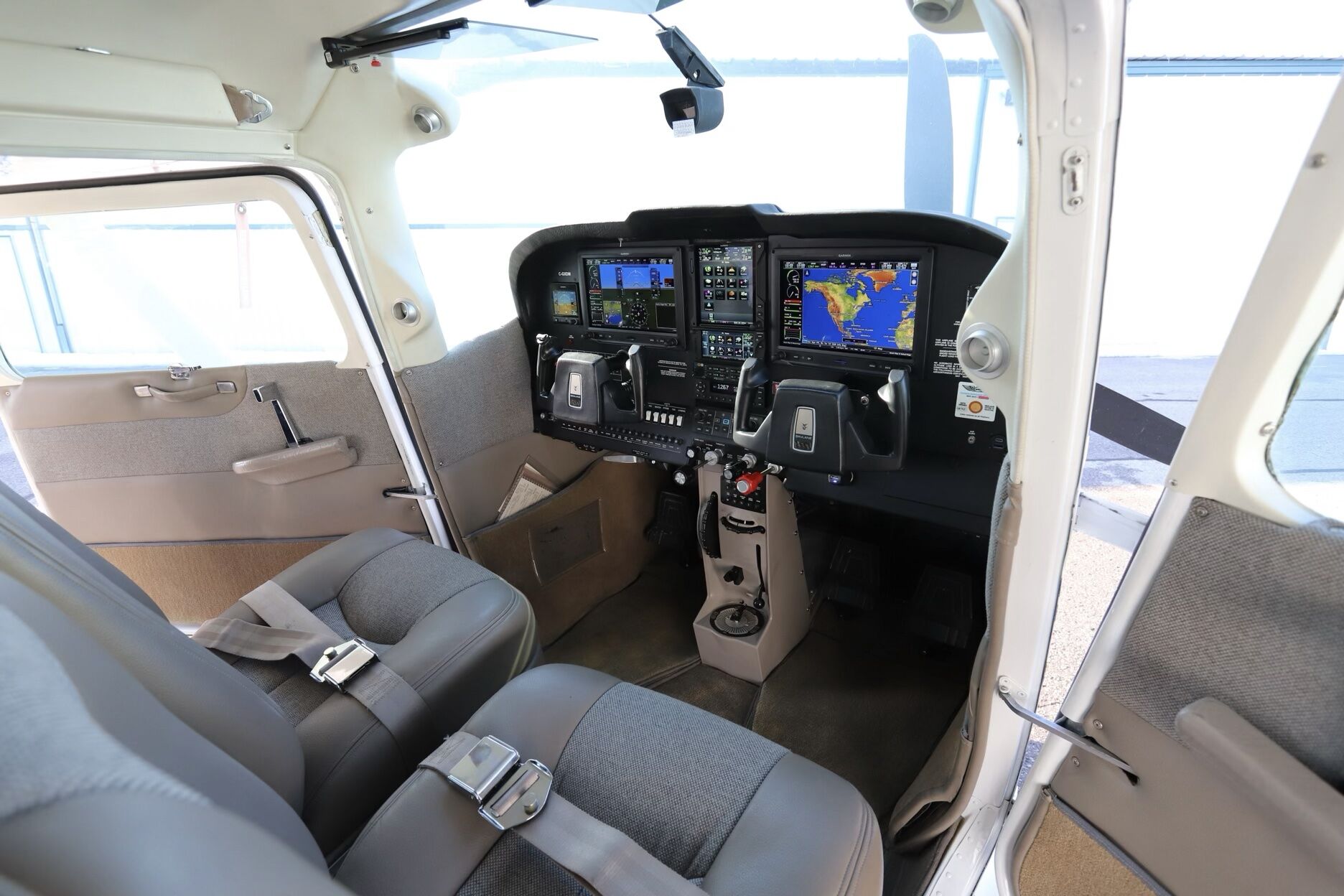 The cockpit has been fully modernized with a Garmin glass suite, including dual G3X Touch displays, GTN-750Xi, GTN-650, Synthetic Vision, Smart Glide, and a Garmin GFC-500 digital autopilot with ESP, yaw damper, and return-to-level. ADS-B In/Out, SiriusXM weather, Flight Stream connectivity, and a G5 standby round out a true IFR platform.